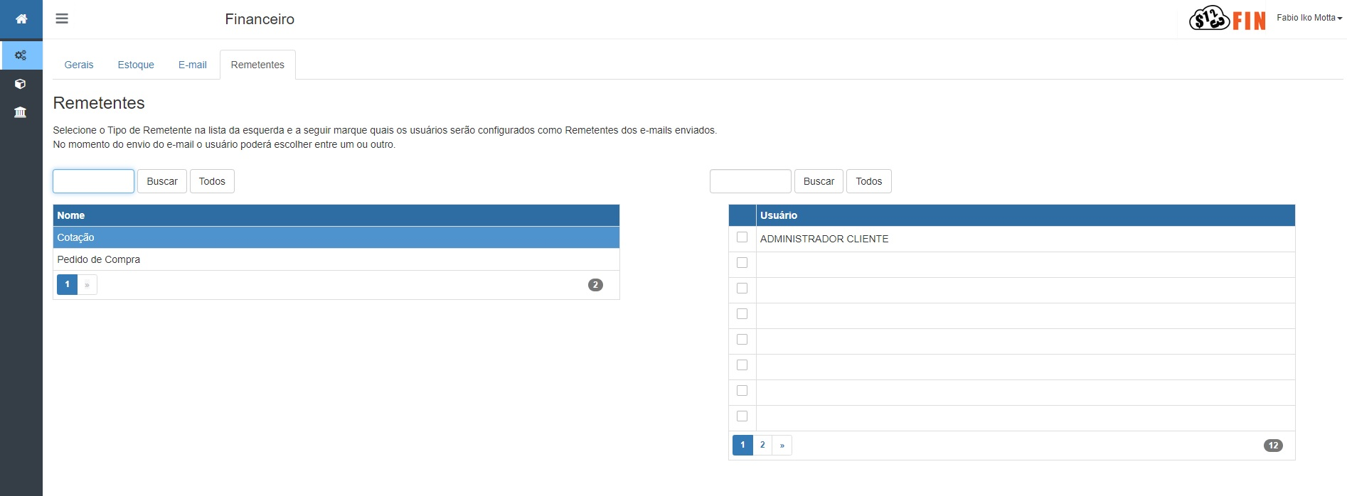 Selecione o tipo de Remetente (Cotação ou Pedido de compra) e clique na pessoa da lista da esquerda que será o remetente do e-mail para o Fornecedor.
